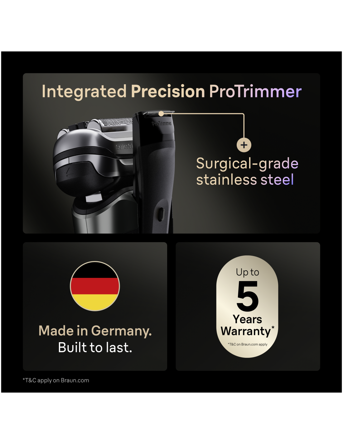Valmistatud Saksamaal – erakordselt vastupidav: Series 9 Pro+ on valmistatud kvaliteetsetest materjalidest ja testitud pikaajaliseks kasutamiseks. 100% veekindel (märg ja kuiv kasutus). Integreeritud ProTrimmer. Kuni 60 min tööaega.