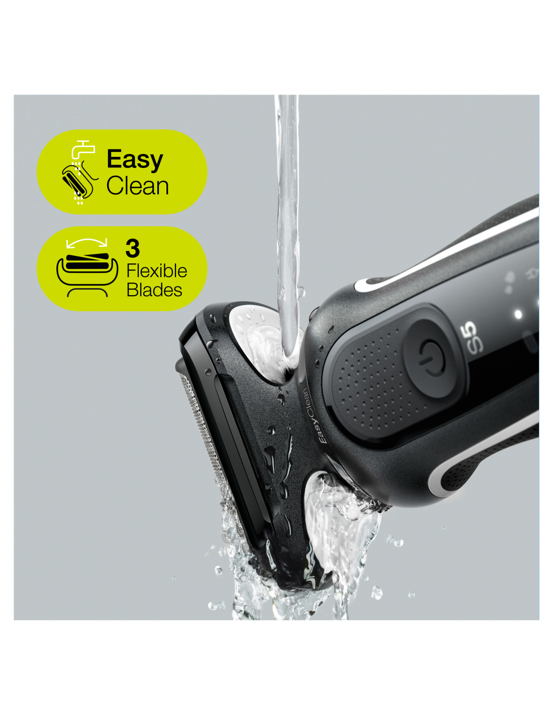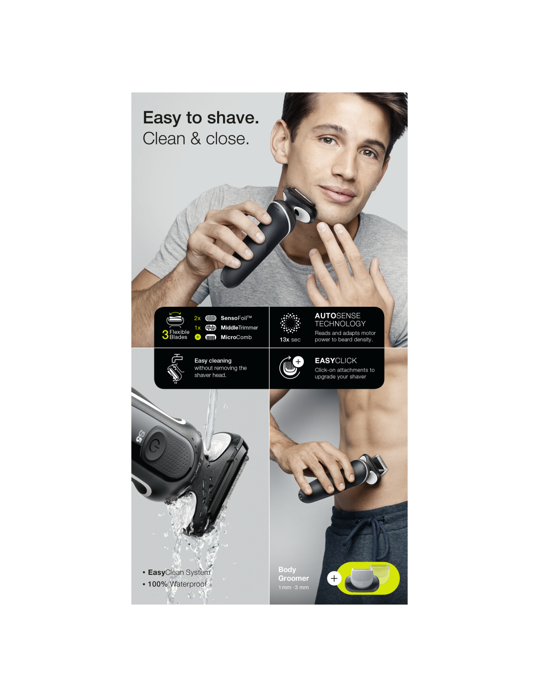 - Nahalähedane raseerimine on nüüd lihtsam: selle elektripardli 3 painduvat tera kohanduvad sujuvalt näojoontega ning EasyClean-süsteem tagab kiire ja hõlpsa puhastamise — ilma raseerimispead eemaldamata.