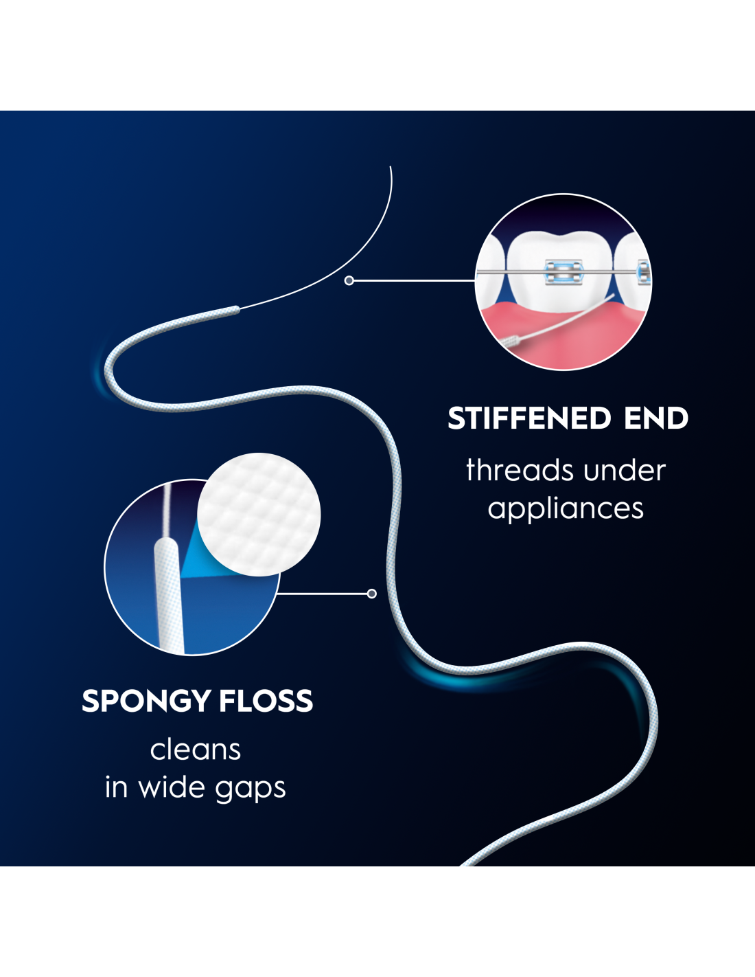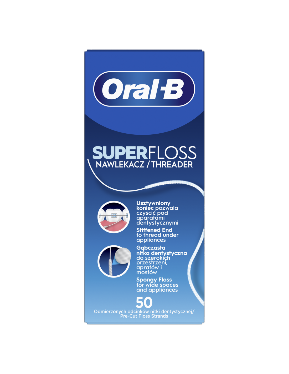 Oral-B Super Floss sobib ideaalselt ortodontiliste plaatide ja breketitele, sildade ja laiade hambavahede puhastamiseks. See koosneb kolmest ainulaadsest komponendist - kõva otsaga niidihoidja, käsnkiud ja tavaline niit - parima tulemuse saavutamiseks töötavad koos.