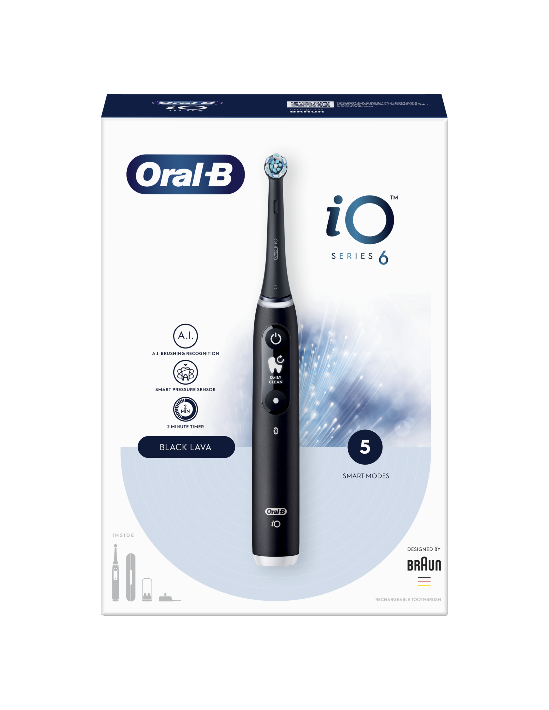 - „iO™“ – tai geriausia „Oral-B“ valymo technologija, kuri sujungia unikalią apvalią šepetėlio galvutę su švelniomis mikrovibracijomis, o naujoviška tiesinė magnetinė pavara sutelkia energiją būtent ten, kur jos labiausiai reikia – ties šerelių galiukais. Gaivus švaros pojūtis ir 100% sveikesnės dantenos vos per vieną savaitę.