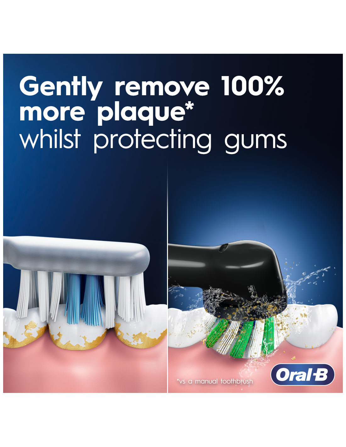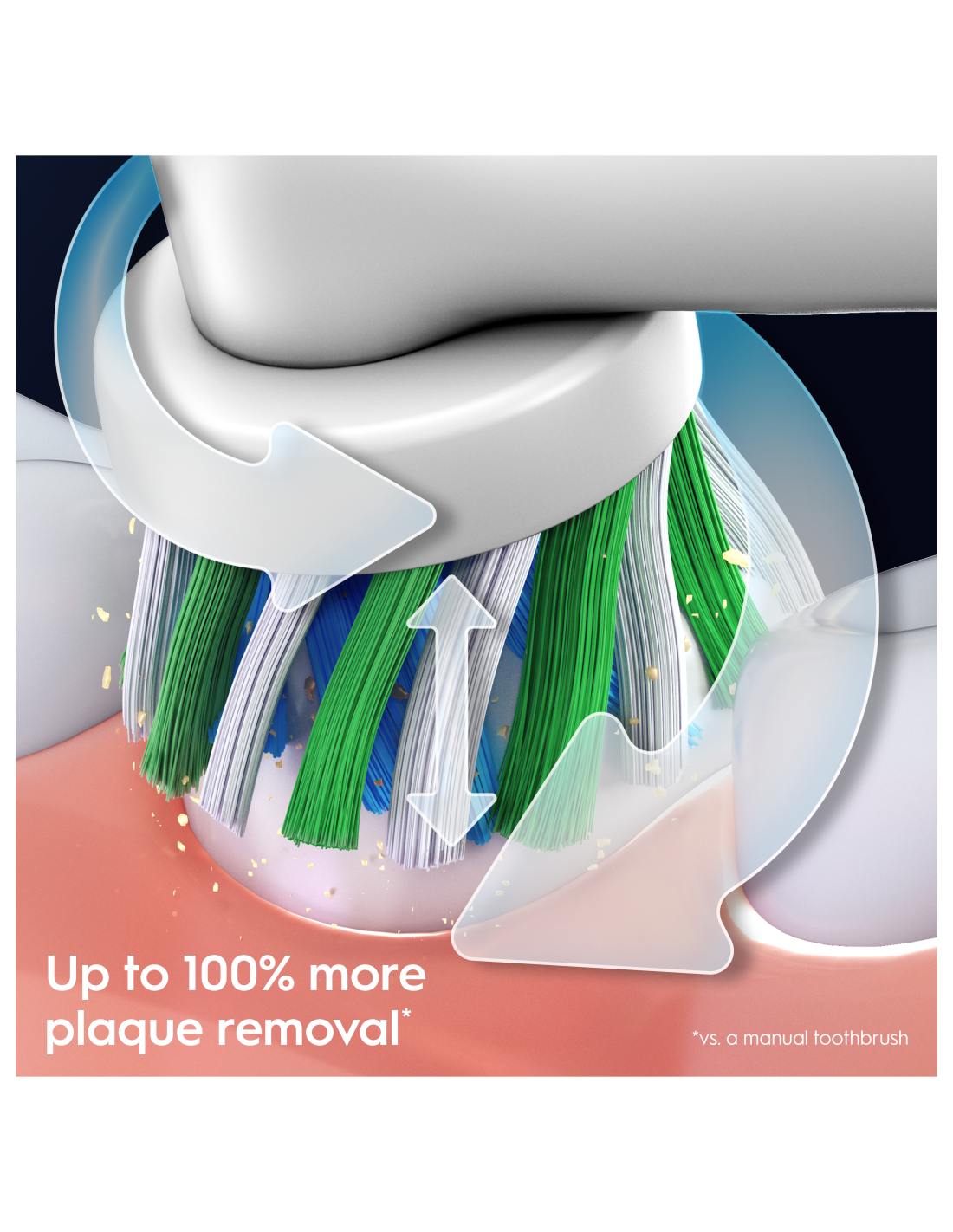 Oral-B apaļā galviņa ieskauj katru zobu tīrākiem zobiem un smaganām, noņemot pat par 100% vairāk zobakmens, salīdzinot ar parastu manuālo zobu birsti.