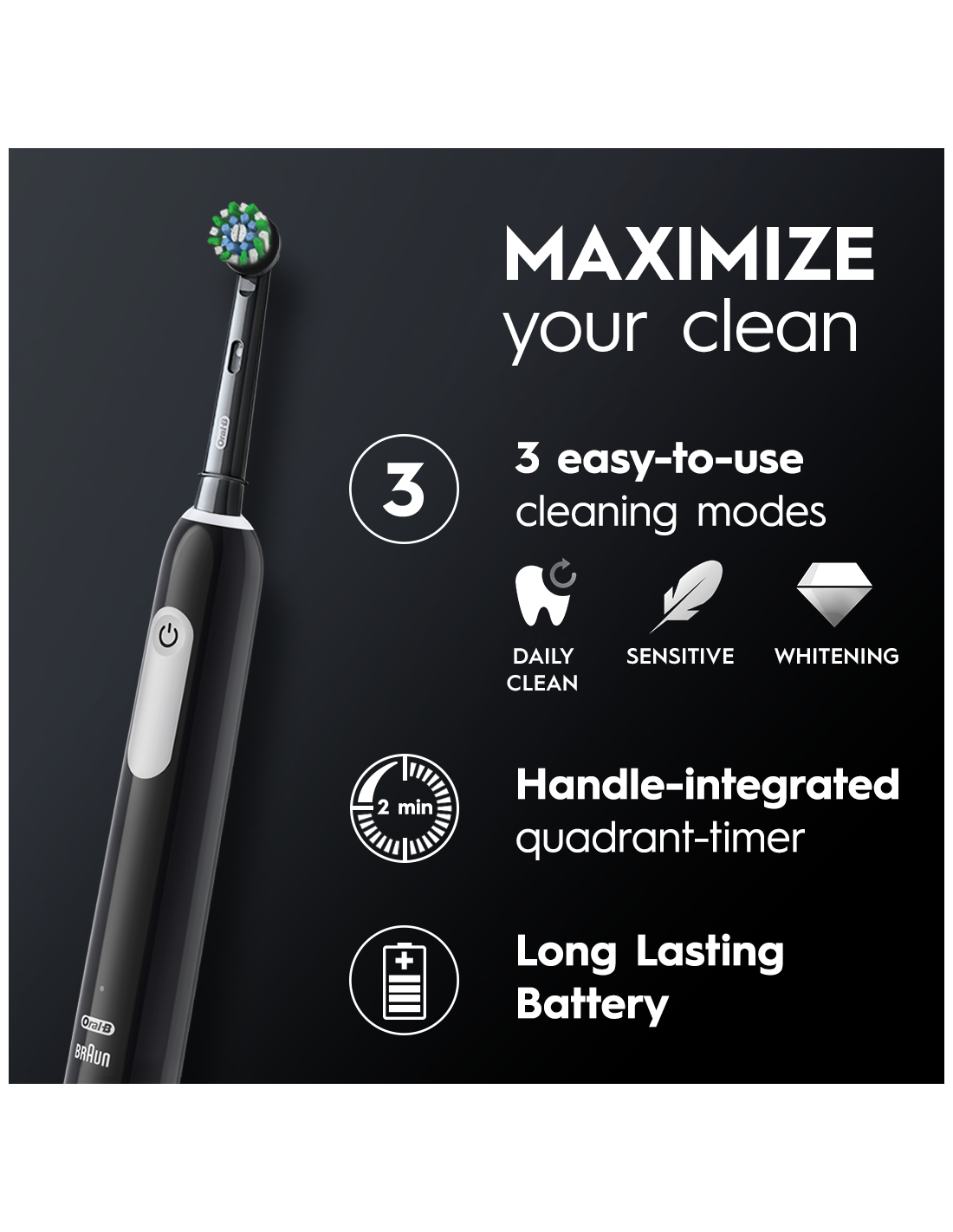 Zobu tīrīšanas režīmi: Ikdienas tīrīšana, Jutīgs un Balināšana.