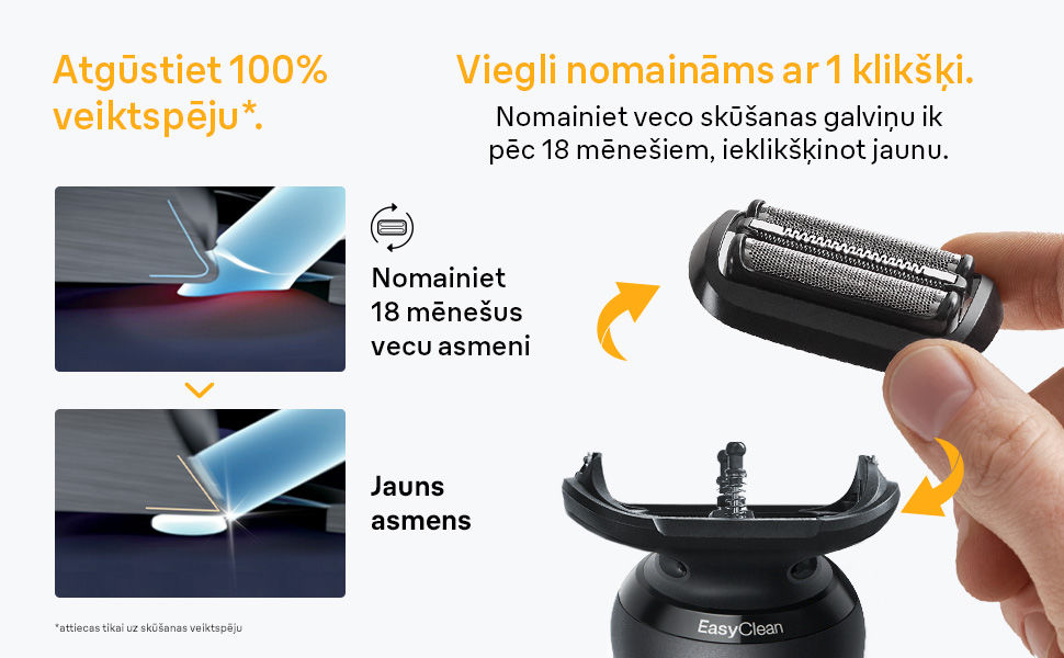 Atgūsti 100% skūšanās veiktspēju: optimālai skūšanai iesakām mainīt elektriskā skuvekļa galviņu ik pēc 18 mēnešiem.