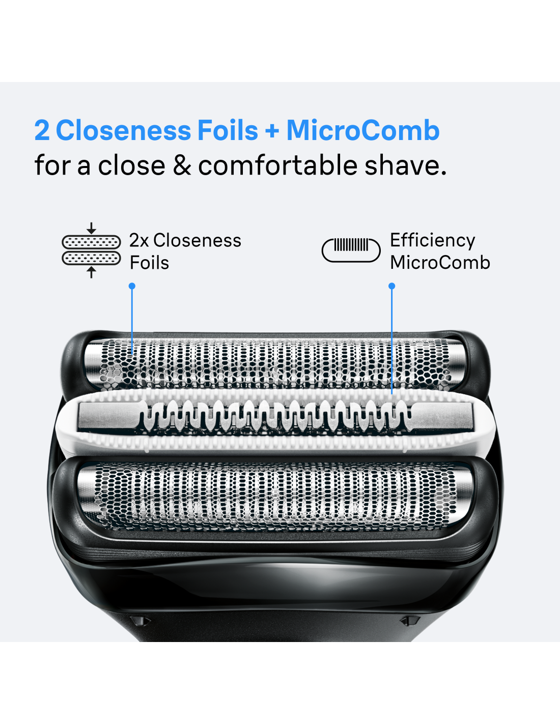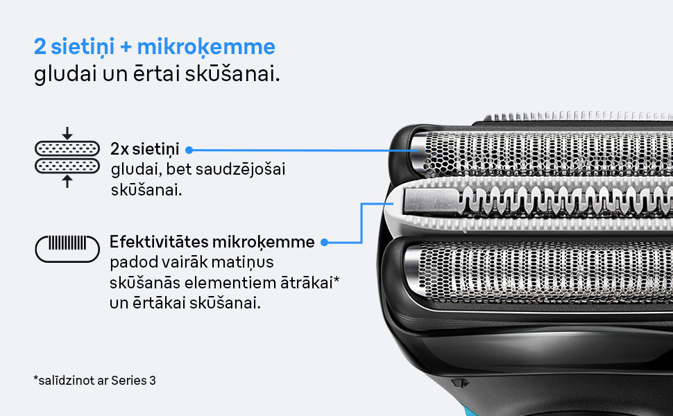 Rūpīga un patīkama skūšanās: 2 skūšanās sietiņi rūpīgai skūšanai un efektīvā MicroComb tehnoloģija nodrošina gludu un komfortablu skūšanos.
